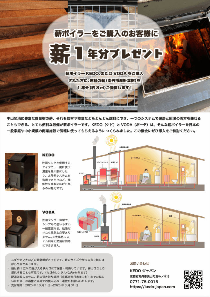 薪ボイラー KEDO、またはVODAをご購入された方に、燃料の薪(南丹市産のスギ・ヒノキ)を1年分(立米換算で約 8 m³)ご提供します !